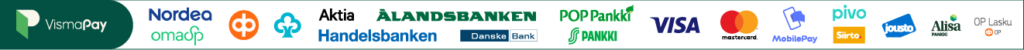 Verkkokaupan maksuvälittäjänä toimii Visma Pay (Visma Payments Oy, y-tunnus 2486559-4), joka on rekisteröity Finanssivalvonnan ylläpitämään maksulaitosrekisteriin. Maksamiseen siirrytään Visma Payn verkkopalvelun kautta ja tiliotteella ja laskulla maksun saajana näkyy Visma Pay tai Visma Payments Oy. Visma Pay välittää maksut verkkokauppiaalle. Maksaminen on turvallista, sillä kaikki maksutapahtumaa koskevat tiedot välitetään salattua yhteyttä käyttäen niin ettei kukaan ulkopuolinen taho näe maksutapahtuman tietoja.