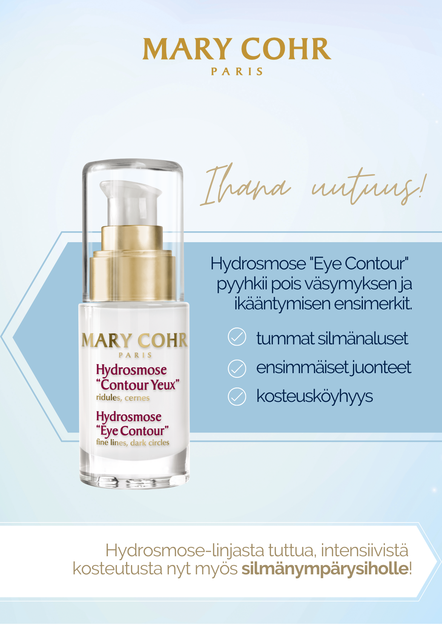Käyttö: levitä aamuin illoin silmänympärysiholle varovasti taputellen.